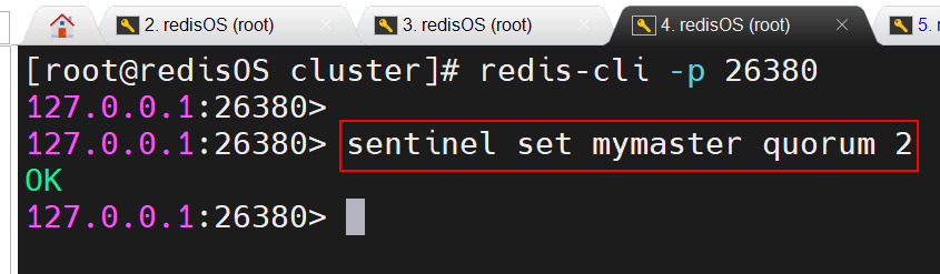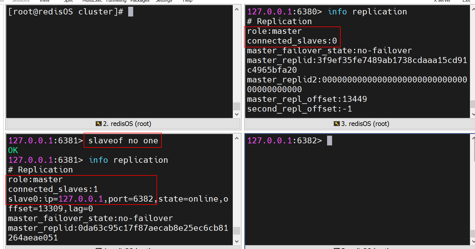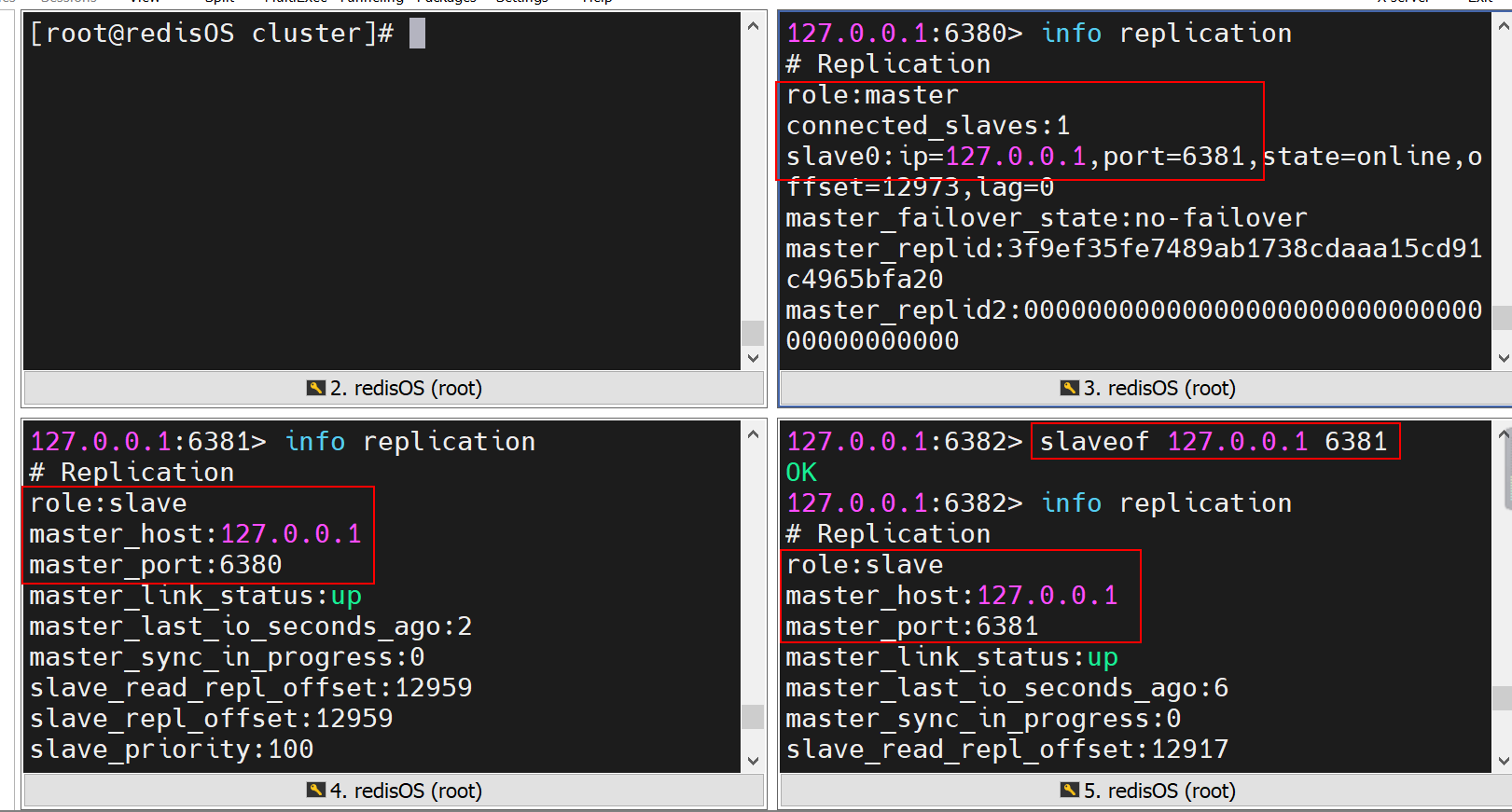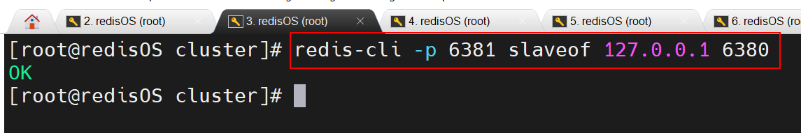 再次创建三个对话框,并通过客户端与三台Redis进行连接。随后,利用slavesof命令将6380号Redis配置为主从节点。