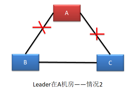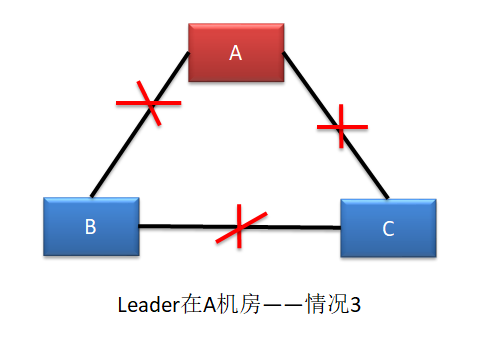 这种情况下,B机房中的主机是感知不到Leader的存在的,所以B机房中的主机会发起新一轮的Leader选举。由于B机房与C机房是相连的,虽然C机房中的Follower能够感知到A机房中的Leader,但由于其接收到了更大term的投票请求,所以C机房的Follower也就放弃了A机房中的Leader,参与了新Leader的选举。
