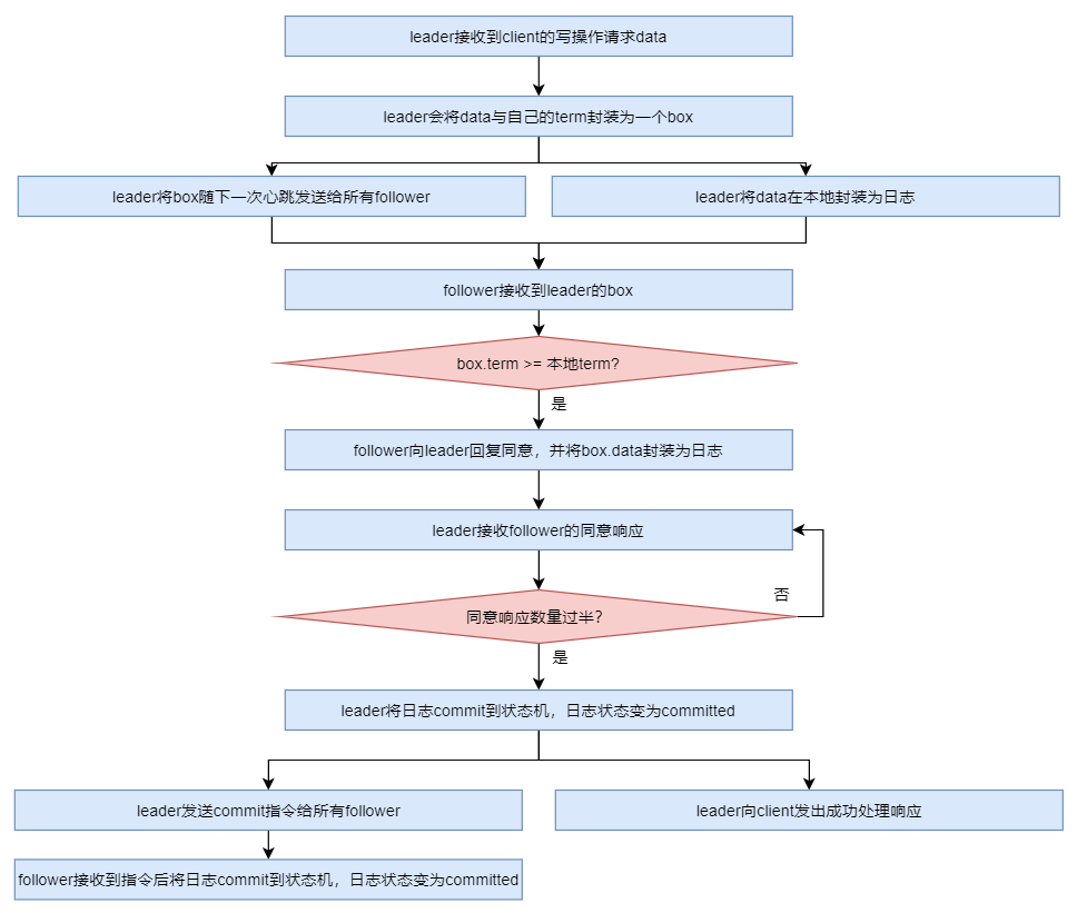 - leader在接收到client的写操作请求后,leader会将数据与term封装为一个box,并随着下一次心跳发送给所有followers,以征求大家对该box的意见。同时在本地将数据封装为日志