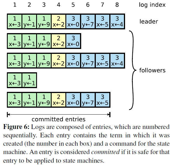 该系统中的日志包含term index、log index和command三项。尽管各节点的日志可能并不完全一致,在主节点通过持续向从属节点发送消息包(boxes),从而能够维持日志的一致性。这表明Raft算法不具备强一致性