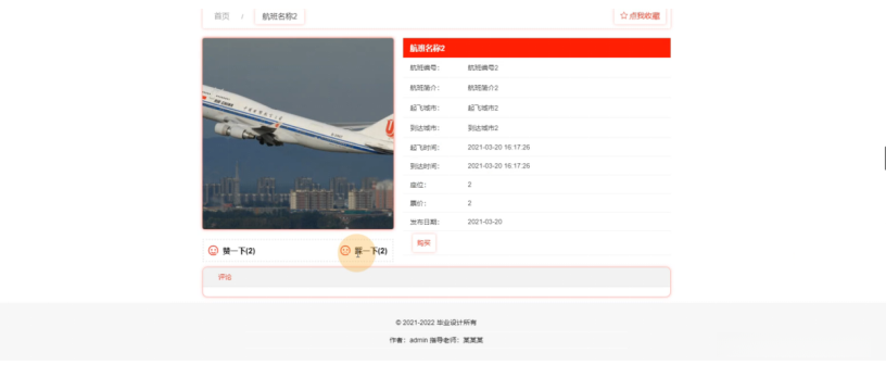 在航班信息管理页面中可以看到与 flights 相关的各项数据项:数据标识项(索引)、航班号(编号)、航站名称(名称)、航站简述(简述)、发起城市(起飞城市)、目的机场(到达城市)、附件图片(航班图片)、发车时间(起飞时间)、抵达时间(到达时间)、坐位数量(座位)以及价格区间(票价)。并根据需求可执行评论查看等操作流程。如图4–9所示
