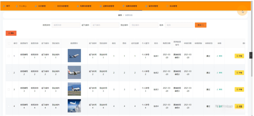 换票信息管理,在换票信息管理页面中可查看索引(序号)以及航班编号(flight number)和航班名称(flight name),其中包括起飞城市(departure city)和到达城市(arrival city),并可查看与该趟机票相关的航班图片(flight images),以及起飞时间和到达时间(departure time/arrival time),同时还可以查询座位(seating positions)及票价(fares)等内容,并根据需要可对上述各项进行修改或删除等操作。(如图4-12所示)