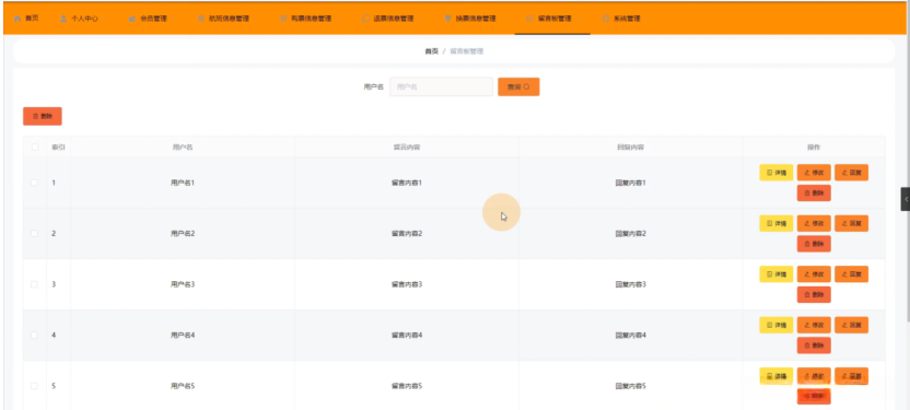 留言板管理模块,在该页面中能够获取索引信息和用户名信息,并根据实际需求进行提交新回复、修改内容或删除现有回复等操作功能