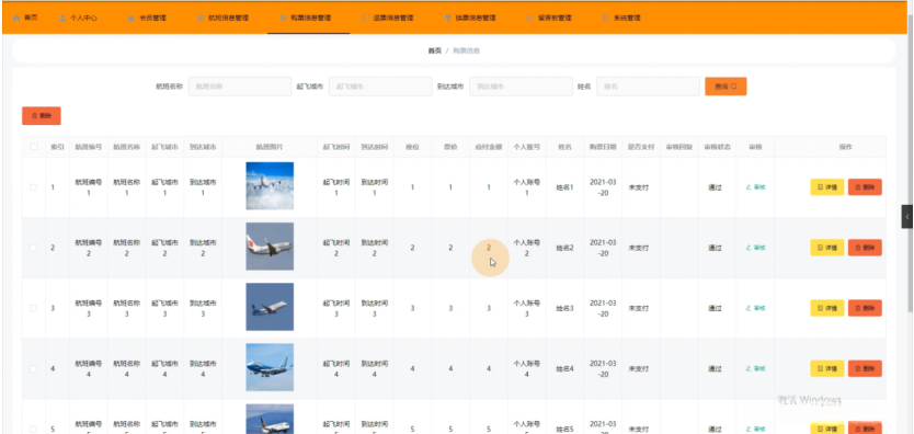 购票信息管理模块中提供了一个丰富的信息展示功能,在购票信息管理页面中用户可以浏览索引列表并获取航班编号、航班名称、起飞城市、到达城市等相关数据信息;同时支持查看航班图片、起飞时间、到达时间等时间参数;此外还提供了座位号、票价等经济指标信息,并根据用户需求可执行删除操作(如图4-10所示)。