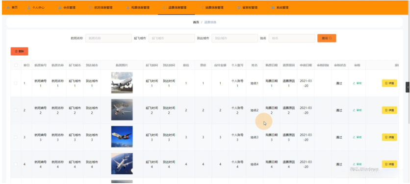 在退票信息管理功能模块下浏览相关信息,在线系统提供了丰富的数据指标供用户查询分析。具体可查看订单编号(订单号)、航班标识(航班号)、飞行行程详情(机舱号)、出发机场位置(起飞城市)、目的地机场位置(到达城市)、图像资料(航班图片)、时间轴显示(起飞时间和到达时间)、座位安排(座位号)与票价金额(票价),同时也能核对个人订单记录(个人账号)、购票基本信息(姓名)及订单处理情况(购票日期),了解退款原因细节(退票原因)以及提交处理进展(申请日期),系统会即时反馈审核结果(审核回复)并告知当前处理状态(审核状态)。如有相关需求,请参考附图4-11相关内容。