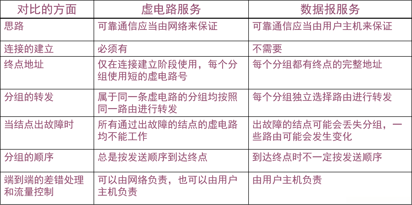 - 网络层也不提供服务质量承诺。即所传送的分组可能出错、丢失、重复和失序(不按顺序到达目的地)