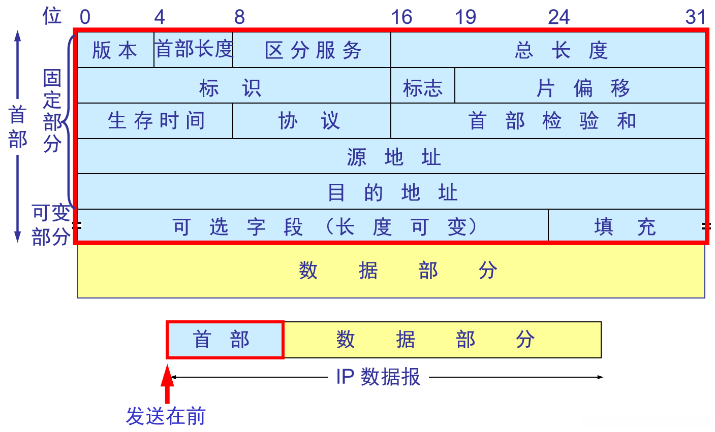 - 首部检验和:只检验数据报的首部。若首部出现错误,则丢弃这个报文。