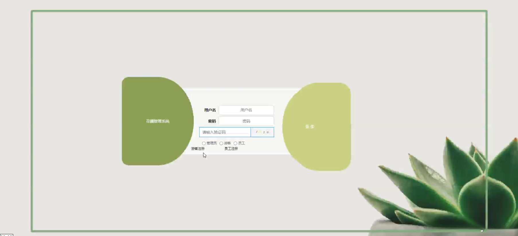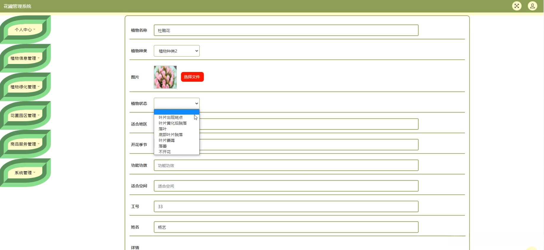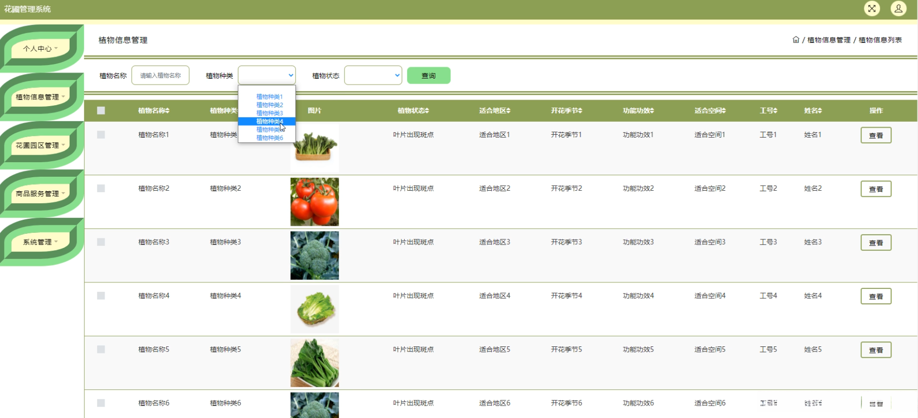 系统功能:游客,员工,植物种类,植物信息,植物绿化,花圃园区,商品服务