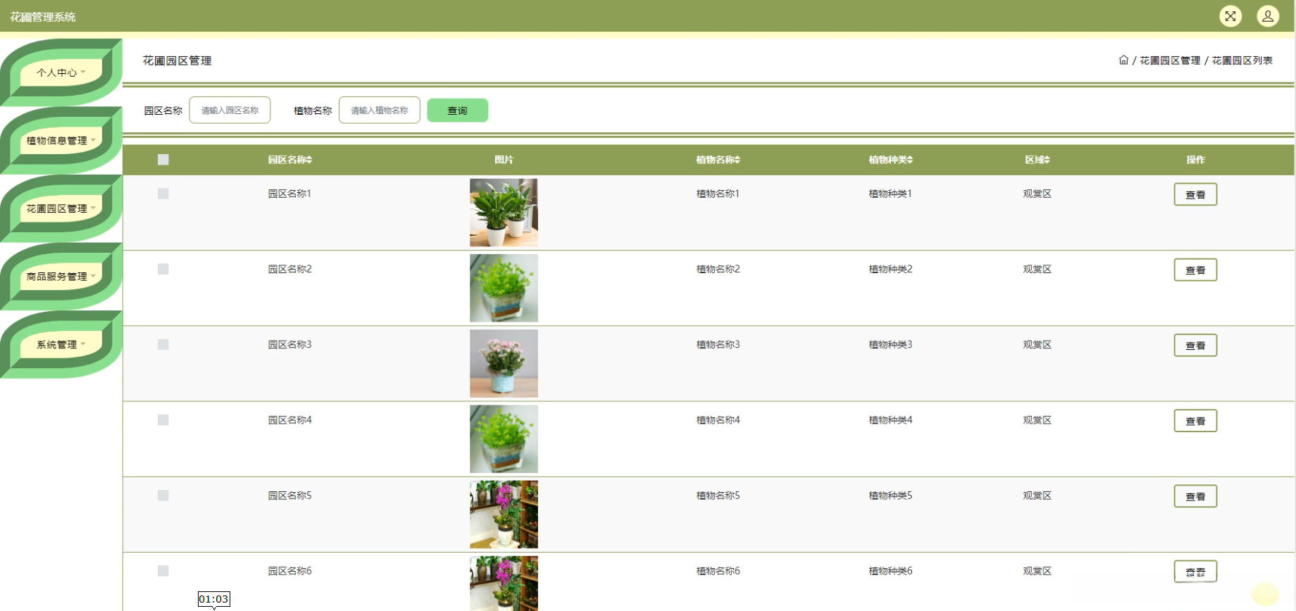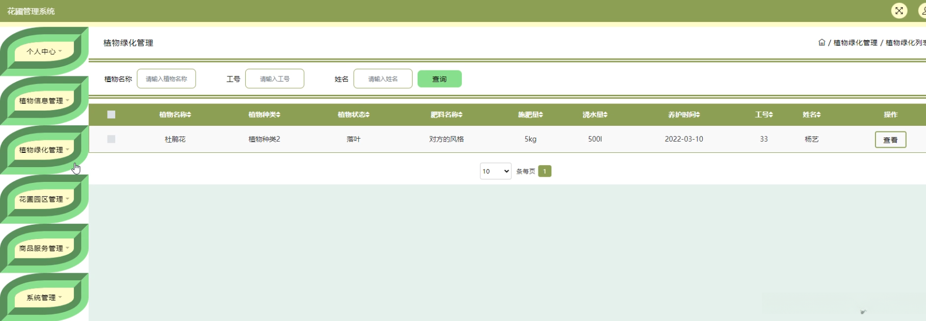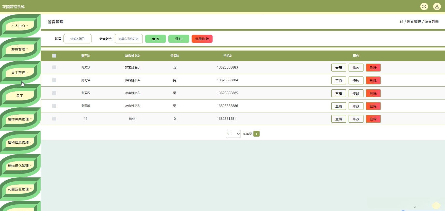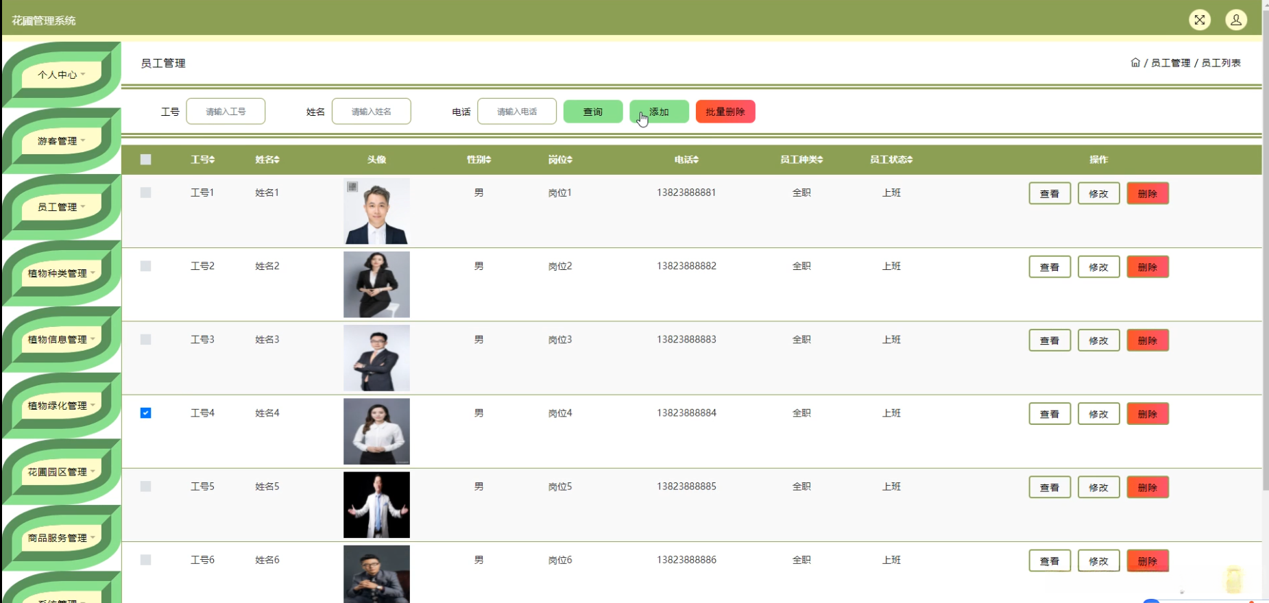 系统功能:游客,员工,植物种类,植物信息,植物绿化,花圃园区,商品服务