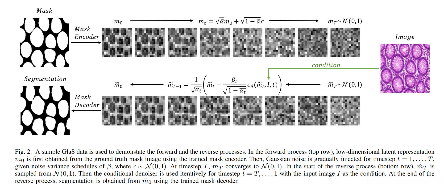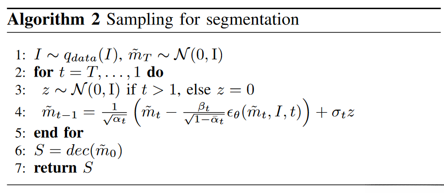 由于该图像编码器独立运作于去噪器之外,在反向过程的初始阶段获取条件图像嵌入即可。在反向过程中我们的核心目标是生成基于图像嵌入的潜在表示 m0。与传统的DPM模型不同,在这一任务中我们从零均值单位方差的高斯分布 N(0, I) 开始,并将其作为时间步 T 的潜在掩码表示̃mT。随后我们对每个时间步 t 进行迭代去噪操作直至完成全部 T 步骤后停止并获得最终掩码表示 ̃m0。此时我们将此掩码表示作为训练好的掩码解码器输入并经过解码运算即可获得最终分割结果 S = dec(̃m0)。如图 2 所示 在下行部分展示了一个完整的反向过程示例 而算法 2 则给出了具体的实现流程图