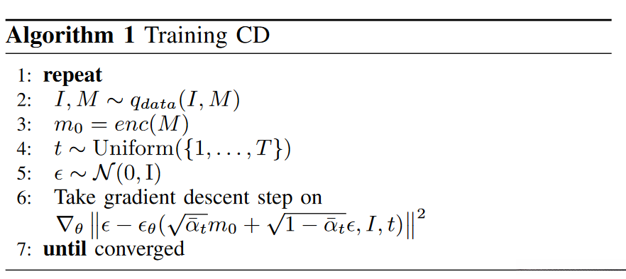 使用经过训练的掩码自动编码器的条件去噪器训练算法如算法 1 所示。