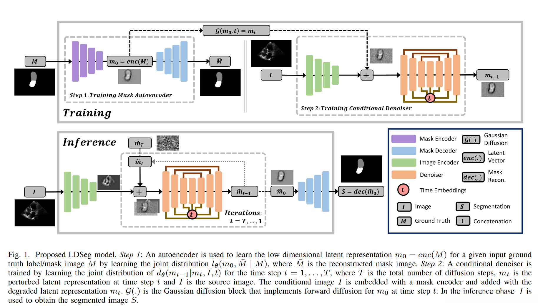 我们提出的LDSeg框架主要由两部分构成:第一部分为掩膜自编码器(Mask Autoencoder),它被用来学习目标物体形状的低维潜在表示;第二部分为基于源图像生成的嵌入信息作为条件,在每个时间步上推断出对应的噪声分布情况。其中图像嵌入是通过图着色自编码器进行学习的过程。其工作流程已在图1中进行了详细展示。