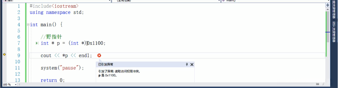 注意:空指针指向的内存是不可以访问的;(0~255号内存编号是系统占用不可访问)