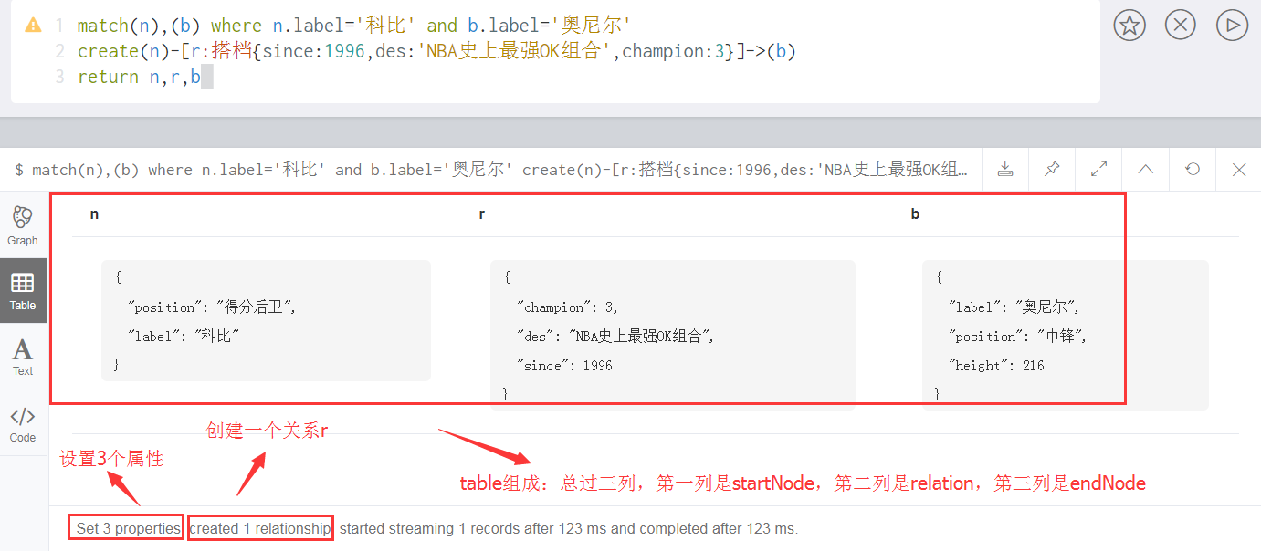 create(n)-[r:搭档{since:1996,des:'NBA史上最强OK组合',champion:3}]->(b)