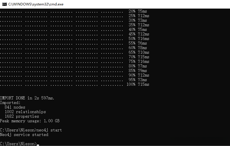 结果表明成功引入了841个节点(由于在原始数据中的节点存在重复情况),同时包含1002条关系(实际记录总数为1002),共计存储了1682个属性值。