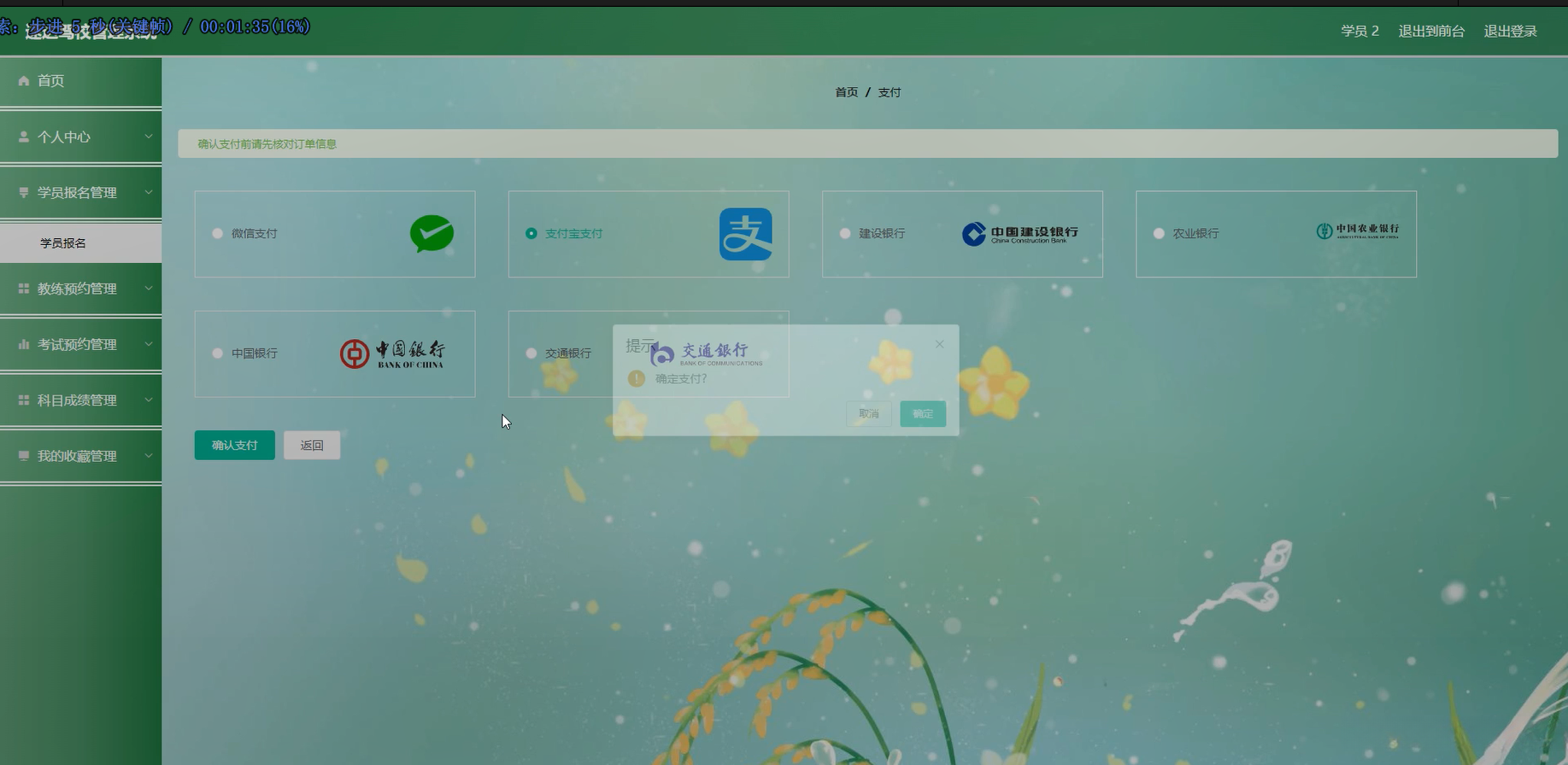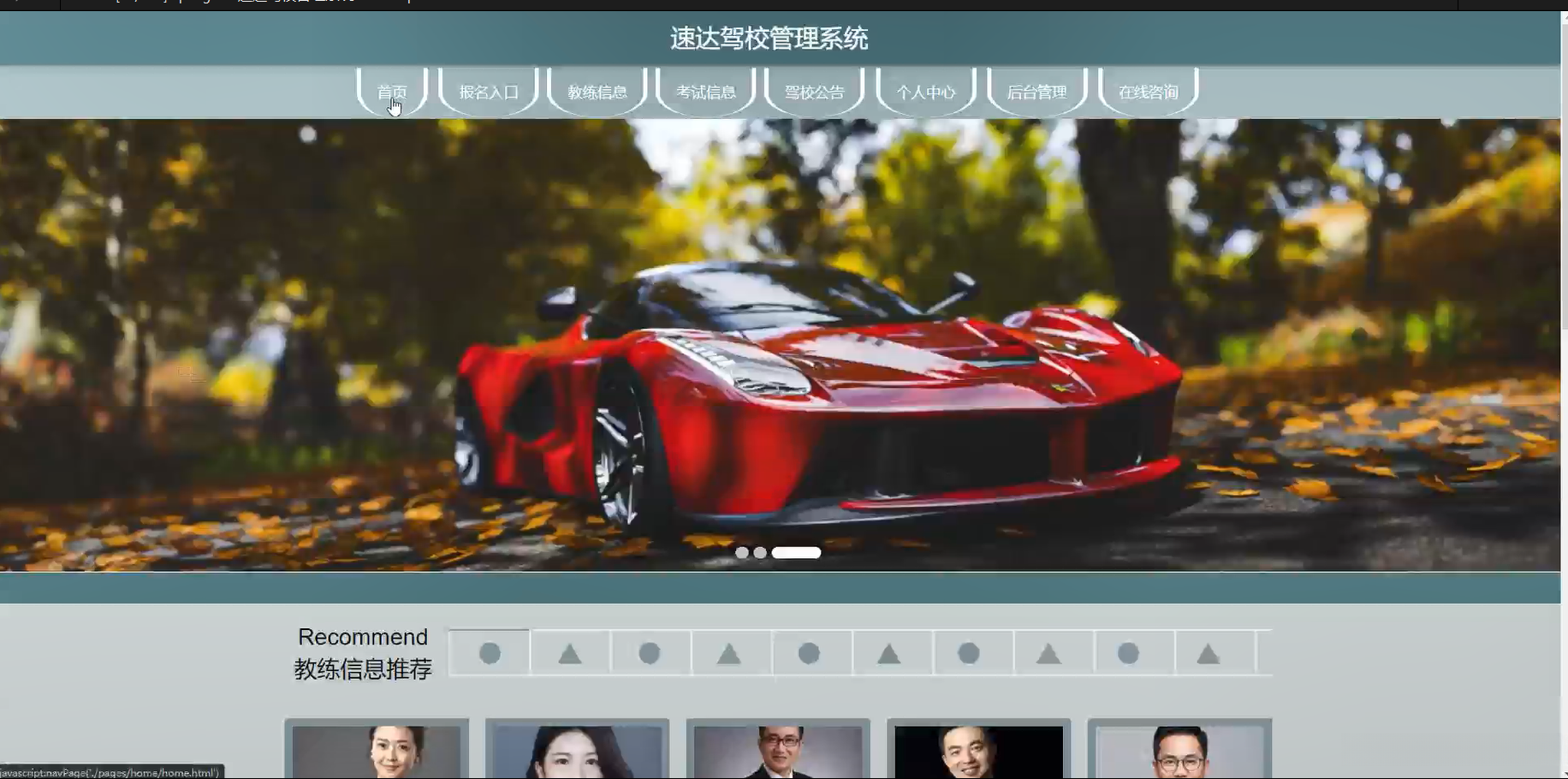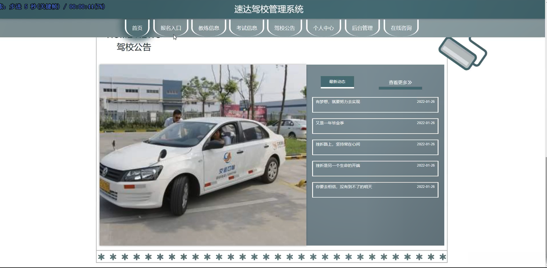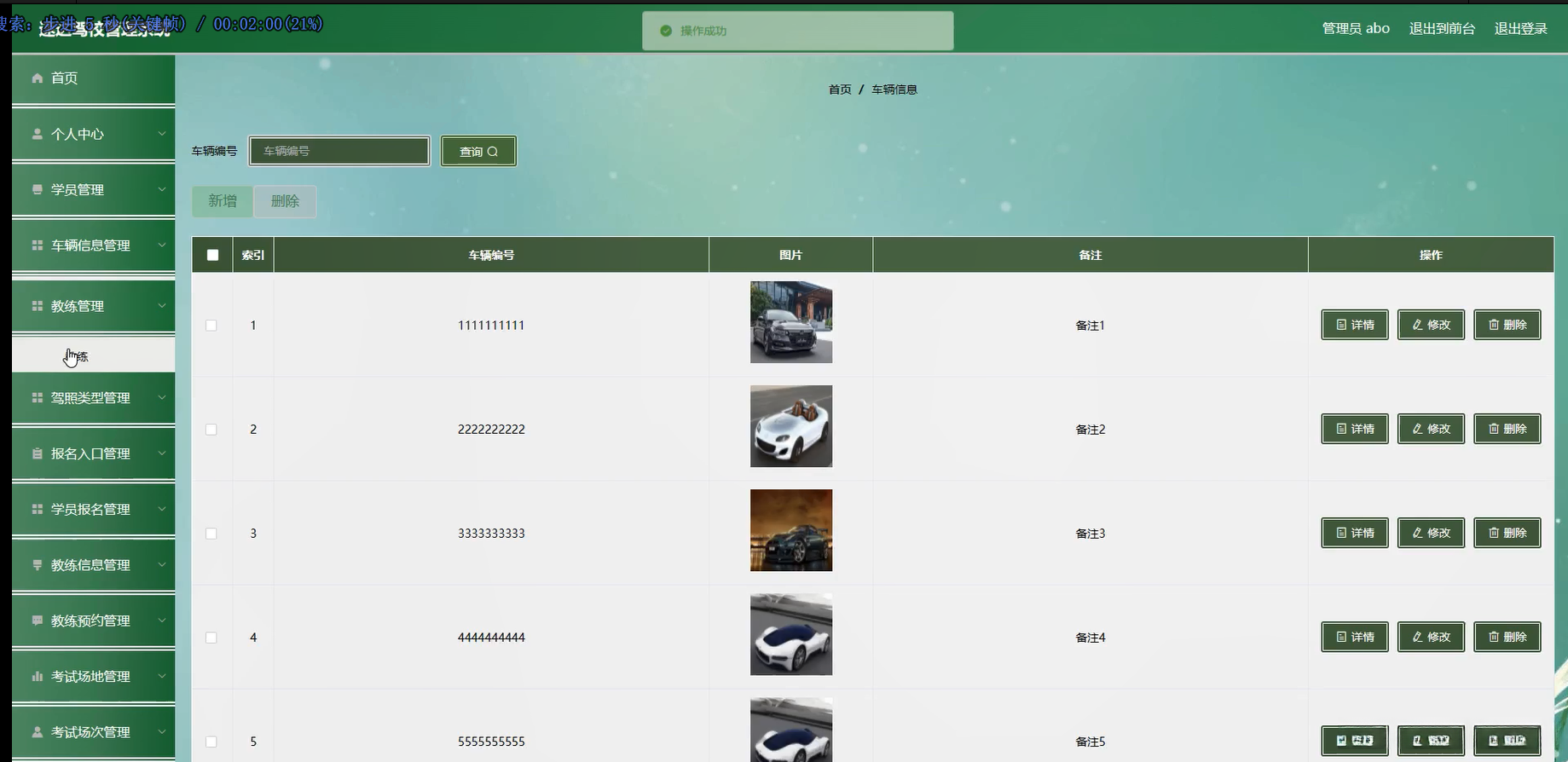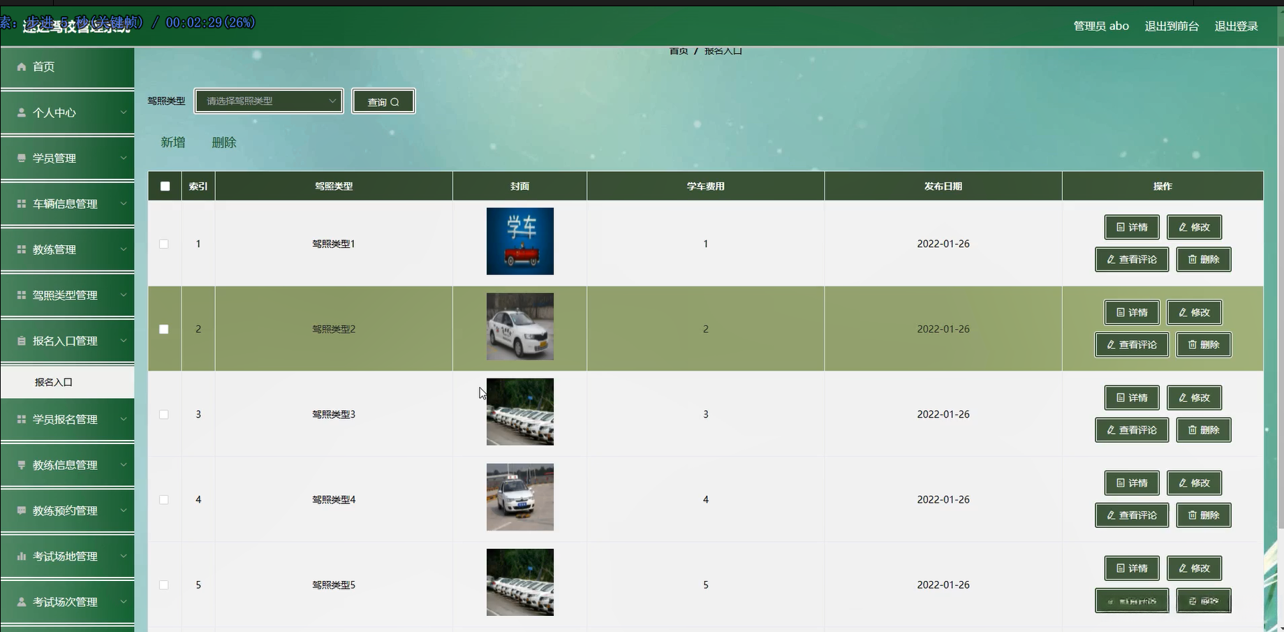 系统内容:学员,科目成绩,教练,教练信息,教练预约,考试场地,考试场次,考试信息,考试预约,驾照类型,报名入口,学员报名,车辆信息