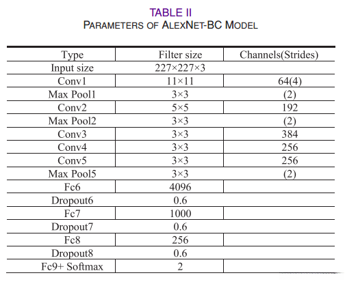 该研究以经典的AlexNet模型为基础,在此基础上开发出一种新型网络架构命名为AlexNet-BC。针对该网络架构在面对小规模训练数据集时可能存在性能瓶颈这一问题,在实验部分我们采用多样的数据增强手段扩展了原始训练集的数据量;同时通过引入迁移学习方法优化并校准了改进型 AlexNet-BC 的参数配置。