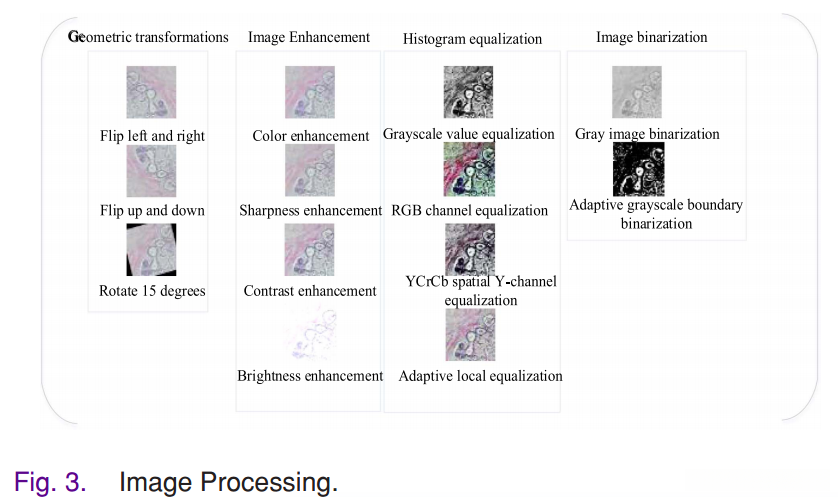 第一步, 从每张原始图片中随机选取六个Patch片, 如图2所示. 每个裁剪后的样本均经过几何变换. 图像增强. 直方图均衡化以及图像二值化四种预处理方式来实现数据扩展, 如图3所示. 本文采用的几何变换包括翻转和平移两种类型. 四种图像增强方法具体涉及色彩鲜艳度提升. 影像清晰度优化以及对比度拉伸等技术. 直方图均衡化的应用则分别针对灰度图与RGB彩色图进行操作, 从而有效提升其对比度水平. 在进行图像二值化处理时, 我们设置了多个灰度阈值以突出关键特征点. 利用上述多模态的数据增强手段将原始数据集规模提升了约20%. 最后将所有经Enhance后的样本统一归一化处理作为网络输入 fed into 网络训练过程