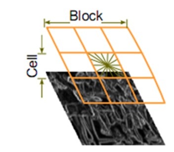 首先将图像划分为若干小的连通区域,并将其称为细胞单元。随后分别采集每个细胞单元内各像素点梯度方向及边缘方向的信息,并收集这些数据以形成方向分布表征。通过整合这些方向分布信息即可构建出特征描述器