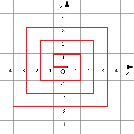 如图所示的p1.pgn图像中有一条螺旋曲线依次穿过平面上每一个整数坐标点。对于任意整数坐标点(X,Y)而言,在该平面内我们定义其到原起点的距离dis(X,Y)为从原起点沿着该螺旋路径至(X,Y)这段路径的长度。
