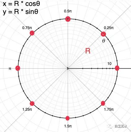 接着,在页面上绘制一组圆,并将这些圆排列成一个环状结构。如果将这个环均分为若干等分,则每个分割点对应一个角度值。根据所设定的半径以及对应的中心角的角度大小关系,则能够计算出各个偏移坐标的具体数值。