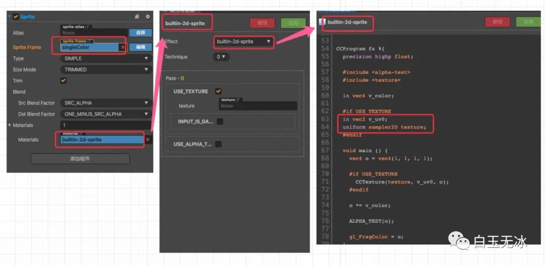 接着创建 effect 节点,并生成 material 材质参数以及 sprite 精灵节点。随后将这些效果与材质和图形元素进行连接。