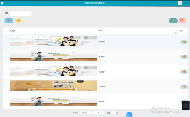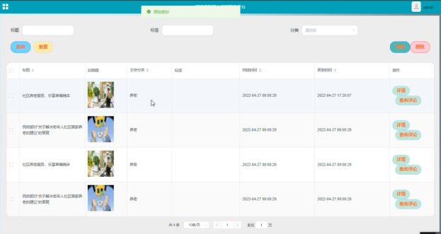 养老智慧服务平台中管理人员是可以对养老智慧服务平台内的养老资讯信息进行维护和管理的。养老资讯界面如下图4-9所示。