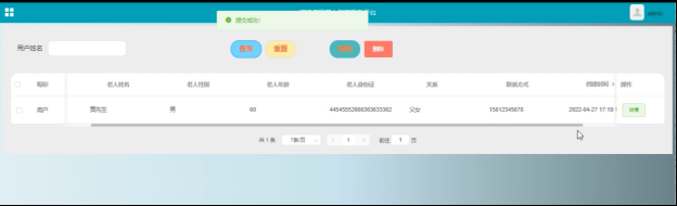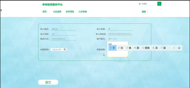 当访客点击了任意入住后将会进入该申请的提交界面,可以了解到该入住的老人姓名、老人年龄、老人性别、老人身份证、用户账号、申请说明、联系方式等,同时可以对该入住申请进行提交,入住申请展示页面如图4-6所示。