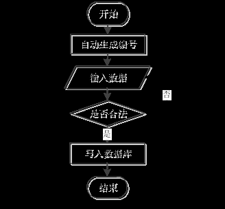用户成功登入系统后就能够实现增加数据的操作,增加数据的编号是特定的,系统生成,用户不能随意填写,除了编号以外,其他增加信息用户自己填写,填写后的信息经过系统验证,验证合法通过就显示增加数据成功了,相反的话,就没有增加成功,图2-1显示的就是在增加数据时的流程。
