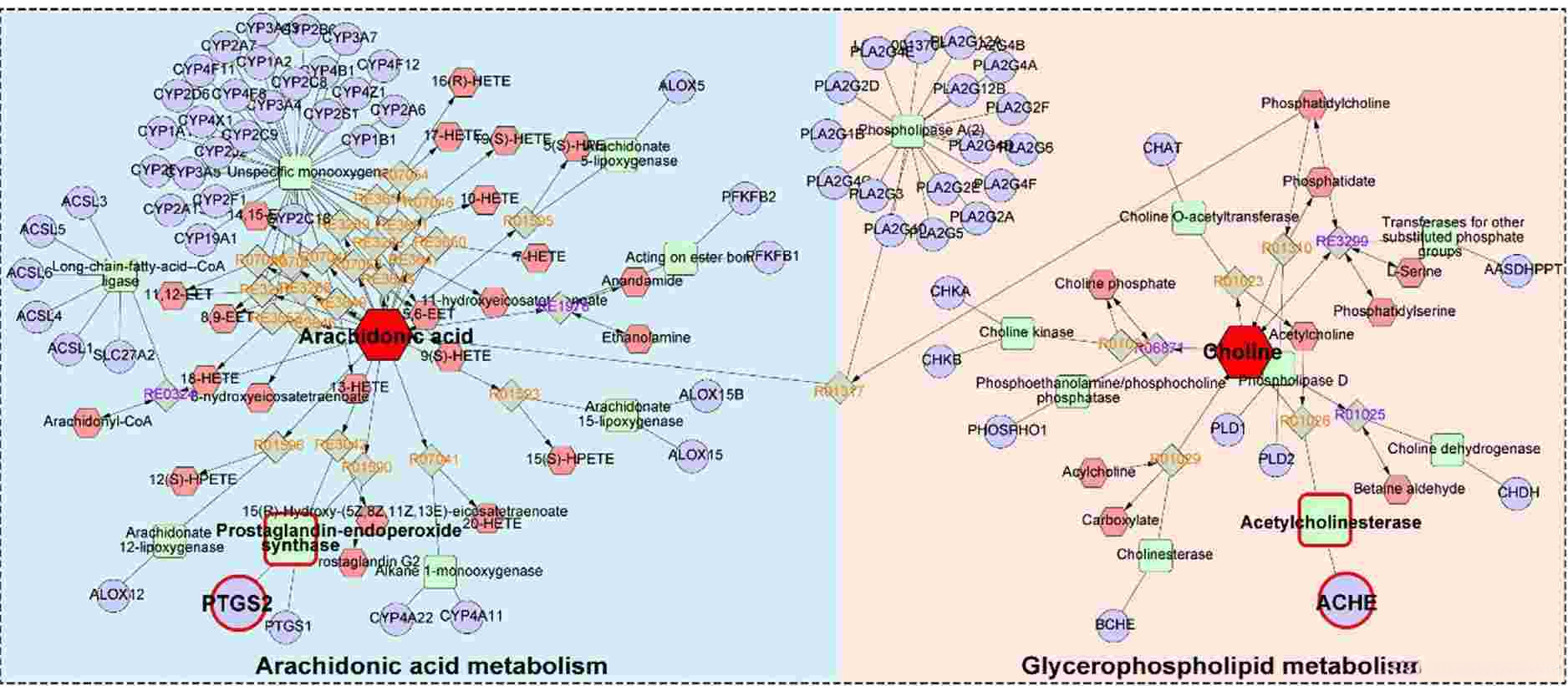 | 四、文献解读及实例解析 | 8、文献解读:代谢组学与网络药理学结合的文章分析流程和套路 8.1 中药化学成分靶点与代谢小分子网络分析实例 (Food Res Int. 2020, 136:109503) 创新点:采用Metscape软件对代谢组学发现的差异代谢物和中药成分的药物靶点关联,聚焦关键蛋白。 |