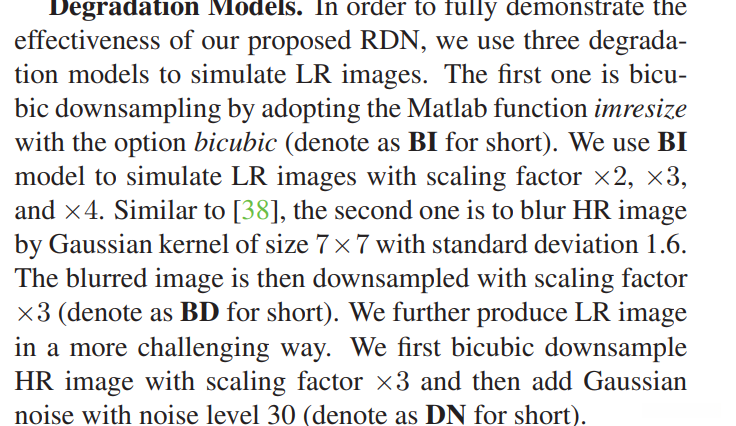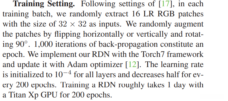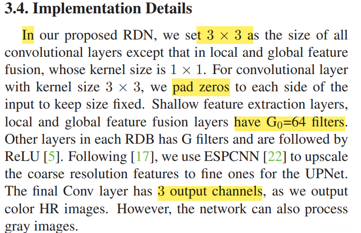 作者在这一部分介绍了卷积的设置。除了融合部分的卷积其他的卷积都是3*3的卷积,作者为了保持卷积后图像的尺寸不变使用了零填充。在局部和全局特征融合阶段卷积核的数量是64个,至于RDB中的卷积核的个数是个超参。