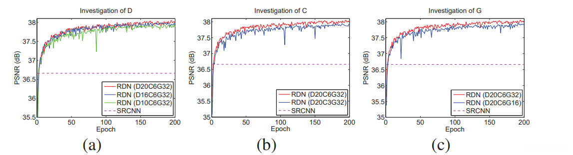 作者研究D,C,G这些超参数对模型的影响,D 表示RDB的个数,C表示每个RDB中卷积层的个数,G表示每个卷积层的个数。