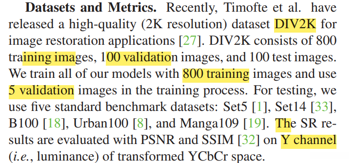 数据数据集,作者选择DIV2K中800张训练集训练,所有结果在Y通道上进行计算。