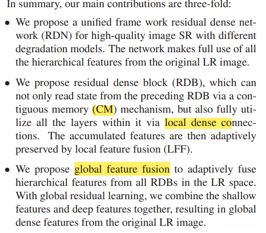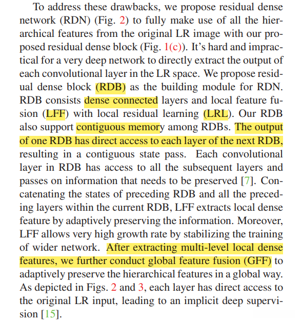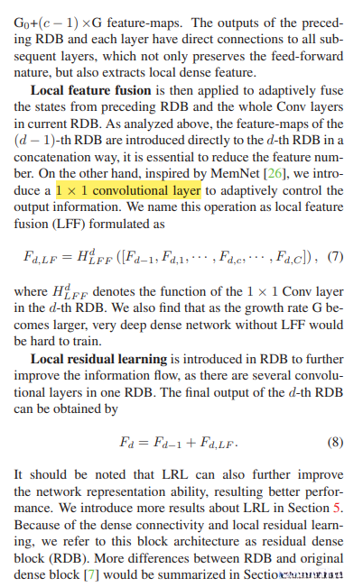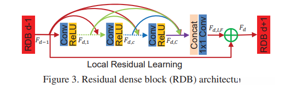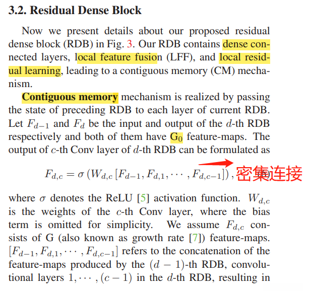 作者在这一部分提出RDB的组成,主要包含三个部分:1 密集连接 2 局部特征融合 3 局部残差学习