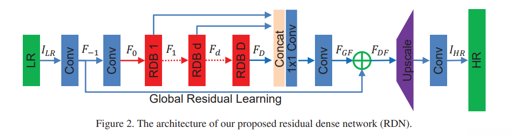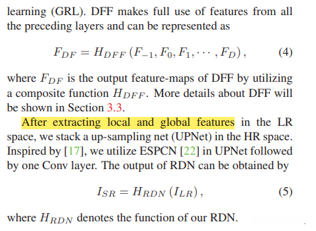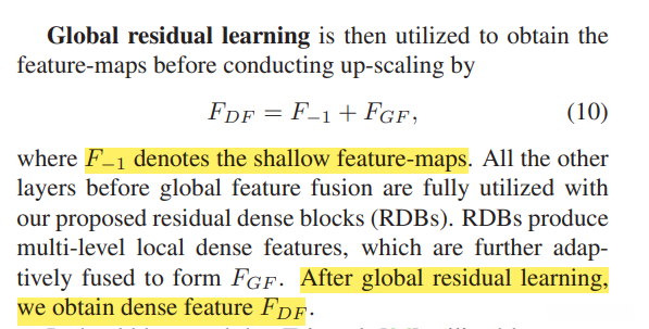 作者在这一部分融合前面RDB模块产生了所有输出,并利用了全局残差学习。