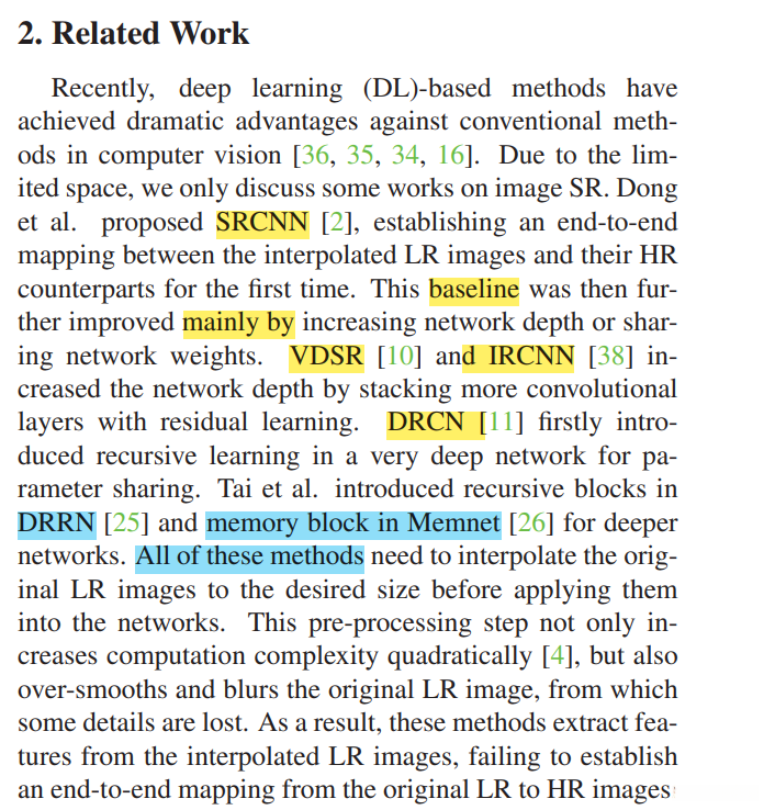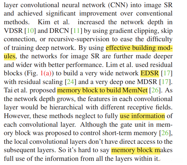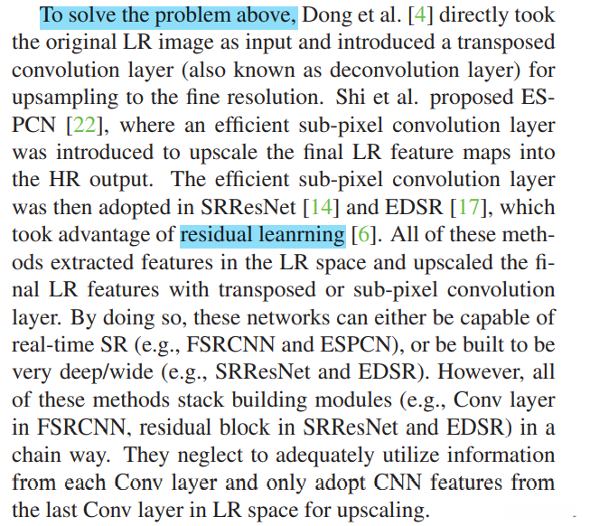 作者这这一部分对现有的论文进行综述。将现有的论文分为两类。第一类,双三次插值作为预处理的,比如说SRCNN,VDSR,IRCNN,DRCN,DRRN,Memnet,作者认为这样不仅增加了计算量,而且这并不是端到端的学习。第二类是直接将LR图像作为输入的,比如说,FSRCNN,ESPCN,SRResNet,EDSR.但是作者这些方法,都忽略了每一层的特征只是采用最后一层的特征进行上采样。