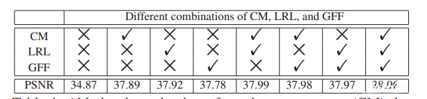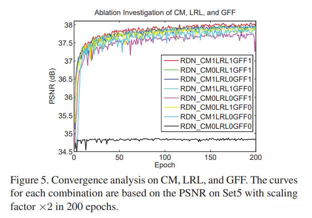 作者使用RDB作为模型的基本模块。RDB包含了密集连接,局部特征融合(LFF),局部残差学习(LRL)。RDB还支持CM(contigous memory)机制(每一个RDB的输出都直接进入下一个RDB模块的每一层)。局部特征融合(LFF)模块串联前面和当前所有层的信息提取局部特征。提取完多层次局部特征,作者构建了全局特征融合模块(GFF)自适应保持分层特征。