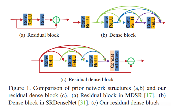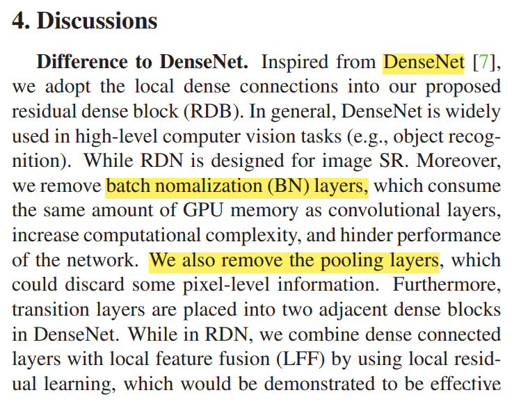 这一部分作者对比了RDN和DenseNet.SRDenseNet,MemNet之间的区别