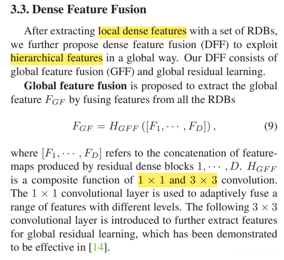 当提取完所有RDB的分层特征之后,作者搭建了密集融合模块,包含全局特征融合(GFF)和全局残差学习。