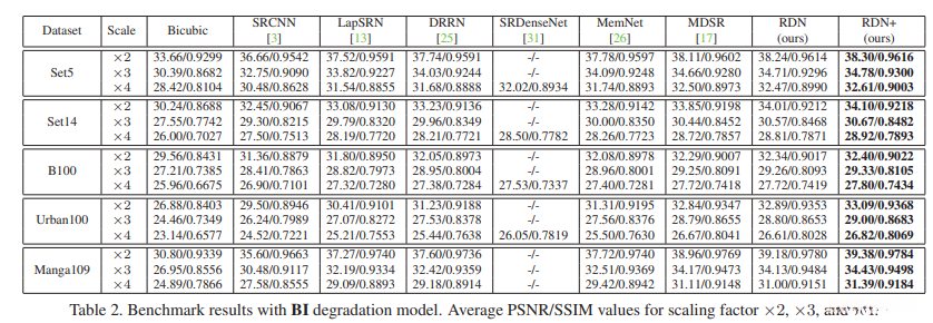在BI退化模型 下的各个算法进行对比,其中SRDenseNet是直接引入别人的结果。