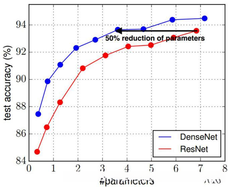DenseNet在识别率上的表现也非常不错,在同一识别率的情况下,DenseNet的参数复杂度约为ResNet的一半。