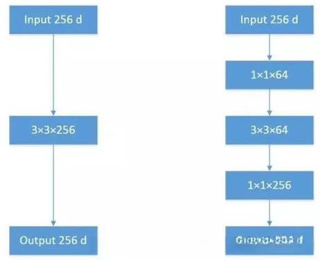 1×1的卷积核能降低计算量,如下图所示,左图表示引入1×1的卷积核之前的网络,其参数量为256×3×3×256=589824,右图表示引入1×1的卷积核之后的网络,其参数量为256×1×1×64+64×3×3×256+64×1×1×256=69632,参数量几乎减少了一个数量级。1×1卷积核也被认为是影响深远的操作,往后大型的网络为了降低参数量都会应用上1×1卷积核,引入1×1的卷积核能达到降维和升维的目的。