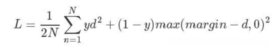 d=||a_{n}-b_{n}||{2} ,代表两个样本特征的欧氏距离,y为两个样本是否匹配的标签,y=1代表两个样本相匹配,y=0则代表不匹配,margin为设定的阈值。观察可发现,当样本匹配时y=1,loss变为
