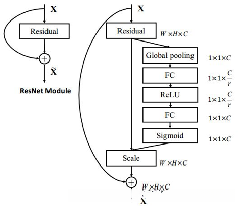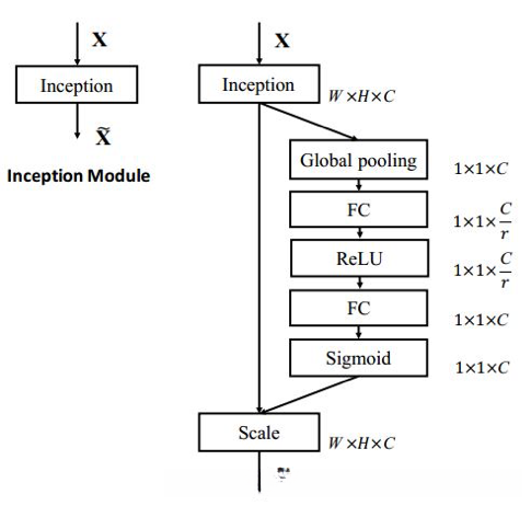 下图是把SENet模型分别用于Inception网络和ResNet网络,下图左边部分是原始网络,右边部分是加了SENet之后的网络,分别变成SE-Inception和SE-ResNet。网络中的r是压缩参数,先通过第一个全连接层把1x1xC的数据压缩为1x1xC/r,再通过第二个全连接层把数据扩展到1x1xC,