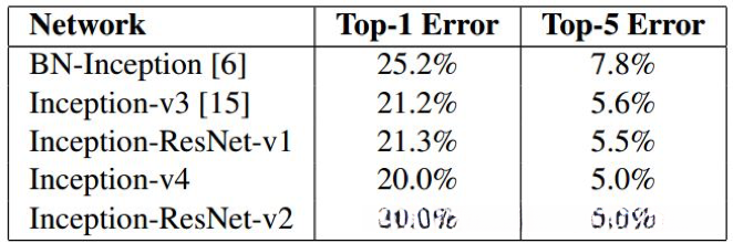 同时作者在该篇论文中还提出了Inception-ResNet-v1和Inception-ResNet-v2。Inception-V4是纯粹的Inception变体,没有剩余连接,具有与Inception-ResNet-v2大致相同的识别性能。几种网络在Single crop - single下的识别结果为:
