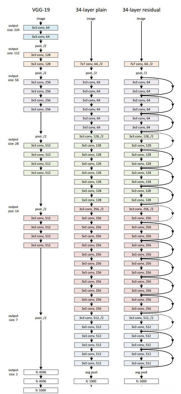 ResNet在运算效率的准确率方面都有所提升,比如ResNet34的运算量只有VGG19的18%,VGG19需要进行196亿次浮点运算,而ResNet34只需要进行36亿次浮点运算,效率大大提升,下图从左到右依次为VGG19、plain-networks34和ResNet34的结构图: