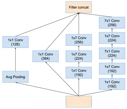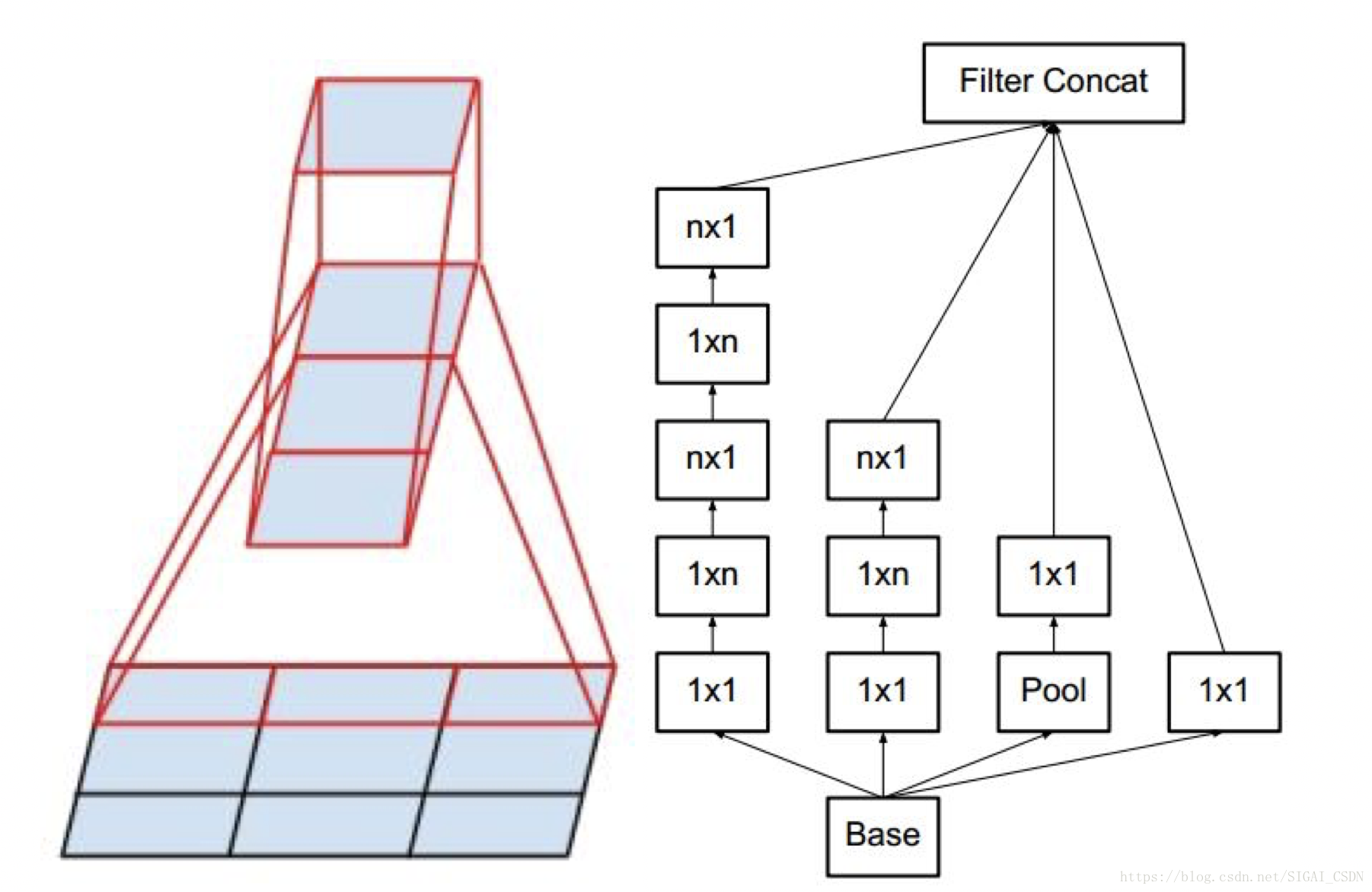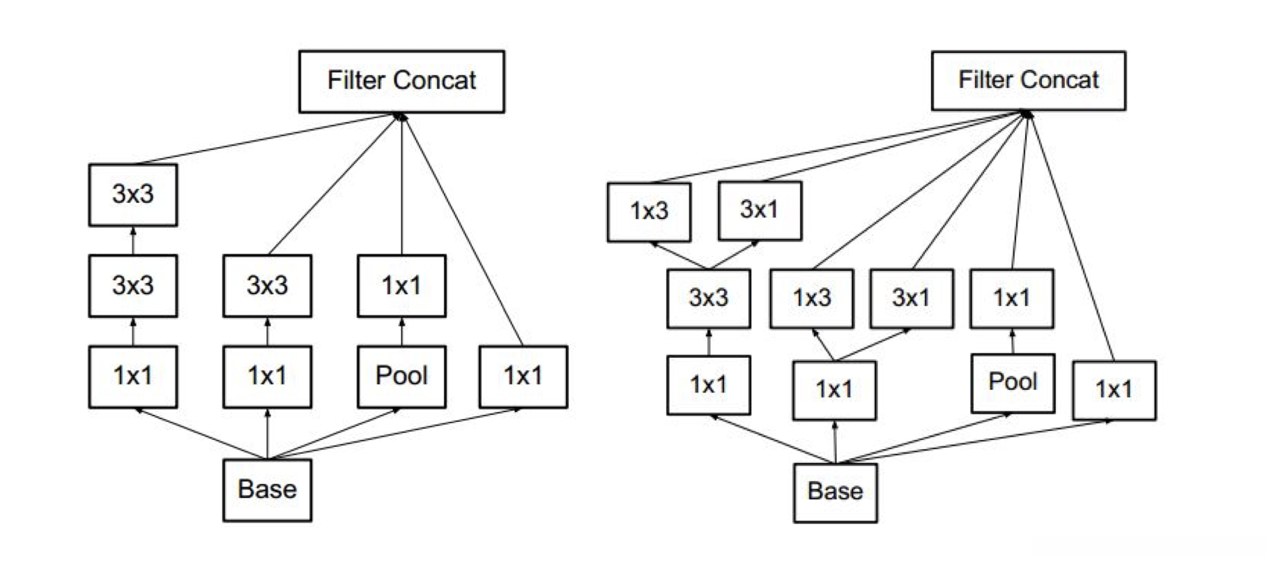 一是引入了 Factorization into small convolutions 的思想,将一个较大的二维卷积拆成两个较小的一维卷积,比如将7x7卷积拆成1x7卷积和7x1卷积,或者将3x3卷积拆成1x3卷积和3x1卷积,另外也使用了将5x5 用两个 3x3 卷积替换,7x7 用三个 3x3 卷积替换,如下图所示。一方面节约了大量参数,加速运算并减轻了过拟合,同时增加了一层非线性扩展模型表达能力。论文中指出,这种非对称的卷积结构拆分,其结果比对称地拆为几个相同的小卷积核效果更明显,可以处理更多、更丰富的空间特征,增加特征多样性。