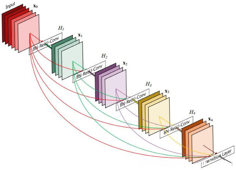 上图是一个详细的Dense Block的模拟,其中层数为5,即具有5个BN+Relu+Conv(33)这样的layer,网络增长率k为4,简单的说就是每一个layer输出的feature map的维度为k。即:第L层网络的输入为k × (L- 1) + k0 ,这里的k0为原始输入的通道数,然后把k × (L- 1) + k0降维为k,再把这个k加上前面所有的连接作为L+1层的输入,即第L+1层网络的输入为k× L + k0。由于DenseNet的每一个Dense Block模块都利用到了该模块中前面所有层的信息,即每一个layer都和前面的layer有highway的稠密连接。假设一个具有L层的网络,那么highway稠密连接数目为L(L+1)/2。和Resnet不同的是,这里的连接方式得到的feature map做的是concat操作,而resnet中做的是elementwise操作。