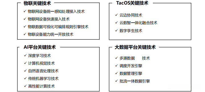 包括物联关键技术、TacOS关键技术、AI平台关键技术和大数据平台关键技术。