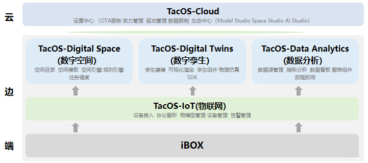 园区采用云边端一体化的部署架构:边端iBOX网关接入物联感知设备;边端TacOS提供边端计算与服务,实现服务能力由中心至边缘的下沉;云端TacOS Cloud通过云边协同服务网络,实现云端管控、协同服务、统一的交付/运维/管控。通过云边端一体化架构,可以更好匹配各类业务场景,提升资源使用效率,提高应用服务效率,更好支撑产业发展和创新。